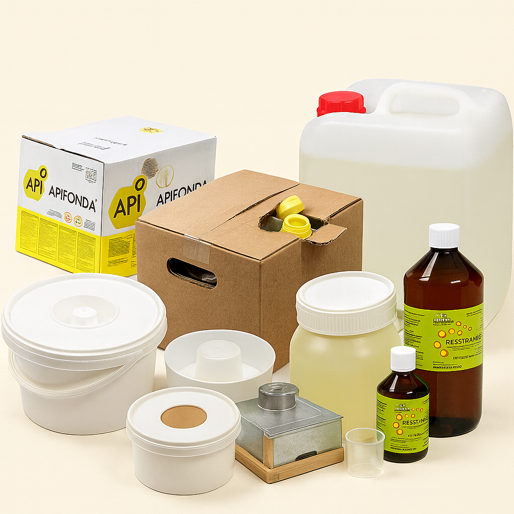 Siebe, Abfüllkübel, Honigeimer, Rührtechnik, Hobbocks sowie Gläser, Deckel und Etiketten für die verkaufsfertige Präsentation.